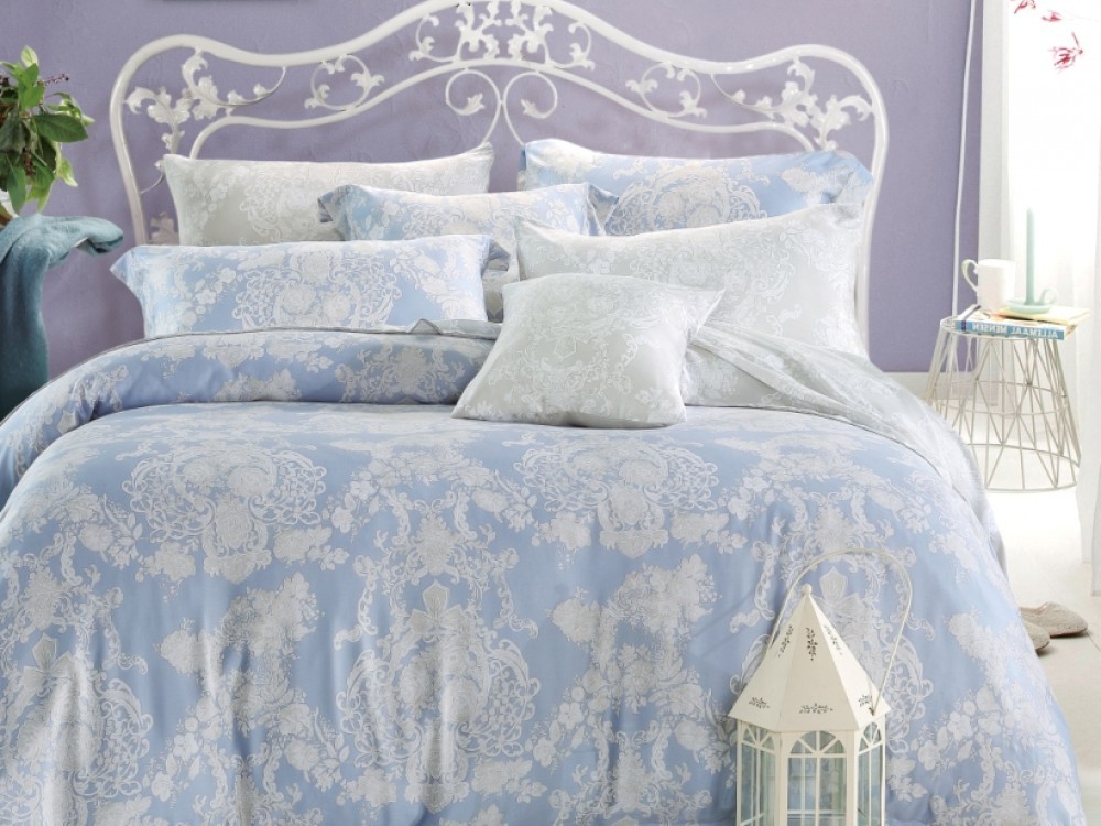 Идеальным местом для романтического отдыха станет кровать с этим комплектом: мелкие мерцающие соцветия на небесно-голубом фоне в сочетании с вставками из полупрозрачного кружева придают воздушность и лёгкость дизайну, становясь сообщниками ваших самых сердечных моментов.