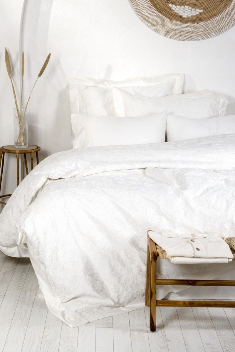 Очень эффектный комплект: тонкие завитки причудливо переплетаются между собой, образуя сплошной ажурный узор. Волокна сотканы таким образом, что возникает ощущение, будто рисунок подсвечен изнутри. Этот комплект можно назвать хамелеоном за уникальную способность менять цвет в зависимости от освещения: он может быть и серебристо-серым и жемчужно-бежевым. Вас несомненно порадует богатая вышивка на двойных ушках наволочек и пододеяльника, как всегда шикарное изголовье у простыни, а так же приятное дополнение в виде наволочки для валика.