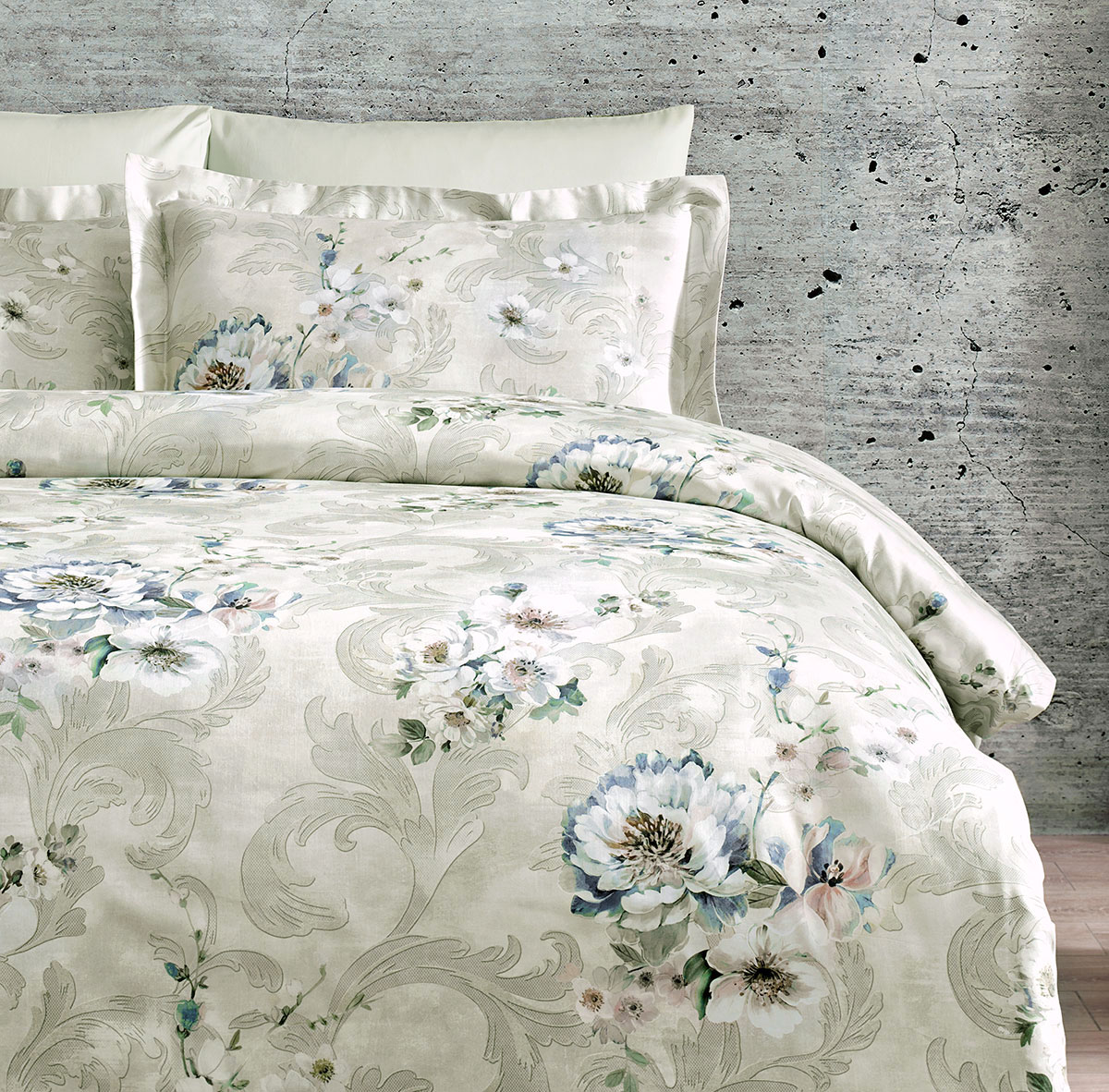 Идеальным местом для романтического отдыха станет кровать с этим комплектом: мелкие мерцающие соцветия на небесно-голубом фоне в сочетании с вставками из полупрозрачного кружева придают воздушность и лёгкость дизайну, становясь сообщниками ваших самых сердечных моментов.